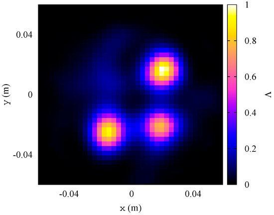 where is the adjoint of the operator , is a fixed relaxation coefficient, and is the maximum number of allowed iterations. In order to exploit the information obtained in the qualitative step, the Newton update has been modified by multiplying the solution of the linearized problem by the value of the normalized qualitative map in the same point of the investigation domain (i.e., ). This is the key aspect of the combination between the qualitative DAS method and the INLW algorithm. In fact, since , the contrast function is updated “faster” in the regions, in which the qualitative method found relevant discontinuities with respect to the background (i.e., when is close to 1), and “slower” when assumes low values, which means in the points outside the qualitatively-detected targets. Newton iterations (i.e., linearization, regularized solution, and update) then continue until a convergence criterion is met or a maximum number of iterations, , is reached. After that, the FH procedure requires that the obtained contrast function is used as the starting guess for the inversion at the subsequent frequency, until all of the available frequencies have been processed.
