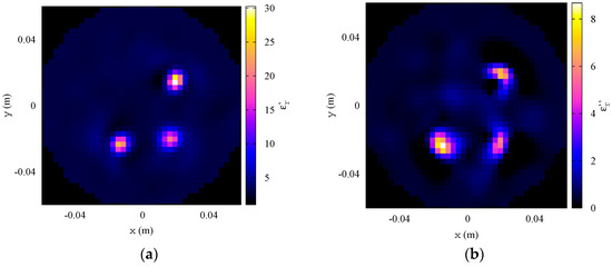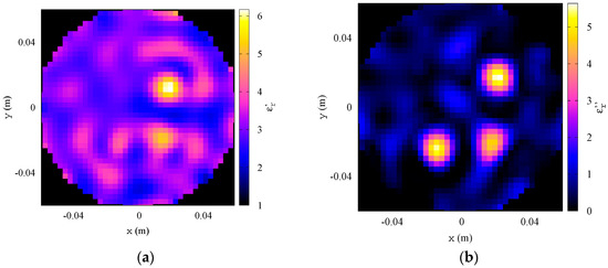 The measured values of with and without the considered inclusions are shown in Figure 6 for a pair of opposite antennas (antennas #6 and #14). It is worth noting that most of the scattering contributions are located between 2 and 4 GHz. Consequently, the FH-INLW method has been applied, by considering the equally-spaced frequencies in this range. The maximum number of inner and outer iterations in each INLW inversion step are and , and the loops are stopped when the variation in the residual falls below 1%. The values of such parameters have been empirically selected on the basis of previous analyses. The results provided by the developed procedure are shown in Figure 7 and Figure 8. In particular, the obtained qualitative map, showing the presence of the three inclusions, is reported in Figure 7. The quantitative reconstructions of the relative dielectric permittivity at the final frequency step are shown in Figure 8a (real part) and Figure 8b (imaginary part). As can be seen, the targets are accurately localized and the dielectric properties are quite correctly estimated. The root mean squared error (RMSE) on the reconstruction of the complex dielectric permittivity is equal to 0.48 in this case. The proposed hybrid inversion algorithm has also been compared with a bare INLW technique, in which the update of the solution in the Newton iterations is not weighted by the qualitative map [31]. The reconstructed distributions of the dielectric properties of the target are shown in Figure 9, and the corresponding RMSE is 0.52. This comparison evidences the effectiveness of the hybridization with the qualitative scheme, which allows for a significant improvement in both the estimation of the complex dielectric permittivity (especially, the real part) and the size of the target, as well as the reconstruction of the background medium.