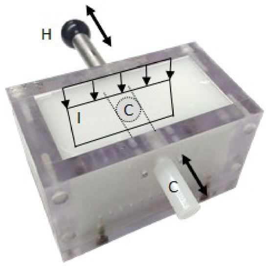 Photograph of the phantom, indicating the location of the imaging plane, I (cross section of the phantom). The artery-mimicking cylindrical inclusion, C, could be manually moved by moving the handle, H.