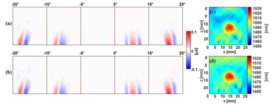 Comparison of conventional Tx and full-Rx steering. (a) Phase shift maps from Tx steering; (b) Phase shift maps from full-Rx steering; (c) speed-of-sound (SoS) image (cross section) from Tx steering; (d) SoS image (cross section) from full-Rx steering. Note the −8 m/s difference between the color scales in (c) and (d).