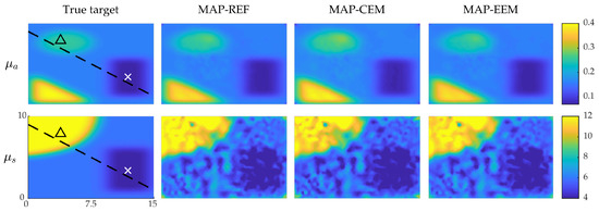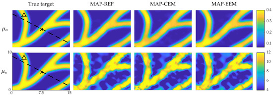 MAP estimates of the simulation with the blood-vessel-mimicking inclusions. True optical parameters (first column); MAP-REF estimates (second column); MAP-CEM estimates (third column) and MAP-EEM estimates (fourth column). First row presents the absorption coefficients and second row the scattering coefficients. In the first column images solid line indicates the cross-section in which the credibility intervals are plotted, and × and △ indicate the points where the marginal densities are plotted. The units of axes are in and colorbars in .