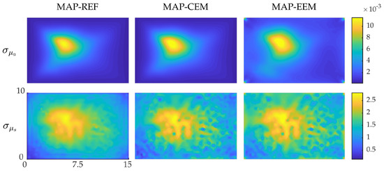 Standard deviations of the reconstructions are shown in the Figure 6. Again, the SDs are larger in the interior of the domain. Furthermore, when compared with each other, the SDs of the MAP-REF and MAP-CEM estimates resemble each other, whereas SDs of the MAP-EEM estimates are slightly larger especially near the boundaries.