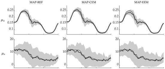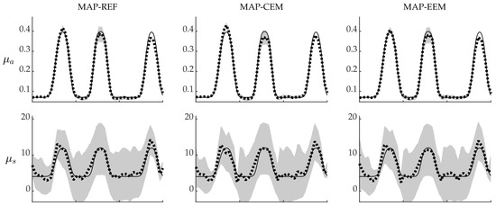 The MAP-estimates with credible intervals along the cross-section through the domain (black dashed line in Figure 1) are shown in Figure 3. Here the differences between the MAP-CEM and MAP-EEM reconstructions can be seen more clearly. The MAP-CEM absorption estimates are larger than the true values in most of the locations, and most of the true values do not lie within the credibility intervals. On the other hand, the MAP-EEM estimates are closer to the true values and the MAP-REF estimates in most of the locations, although in the position of the inclusion with high absorption (left side of the cross-section) the MAP-CEM estimates seem to be closer to the true values than the MAP-REF and MAP-EEM estimates.