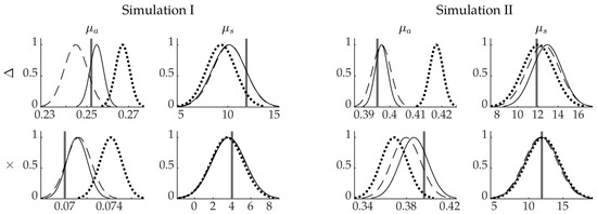 Bayesian approach for image reconstruction and reliability estimation with and without discretization errors was studied with two-dimensional (2D) simulations. Compensation of the approximation errors through Bayesian approximation error modeling was studied. In the simulations, a rectangular domain of size 15 × 10 mm was considered. Two targets were investigated: (I) large smooth inclusions; and (II) blood-vessel-mimicking inclusions. In the simulations, absorption and scattering coefficients were chosen to be in the scale of the optical properties of fat tissue and blood [2,62,63]. Further, scattering anisotropy parameter of and light reflectivity were used.