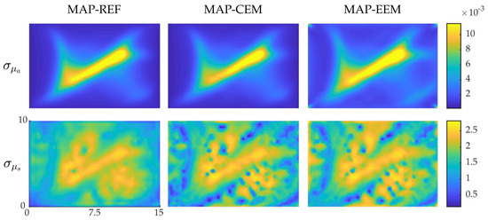 Standard deviations of the posterior distribution approximation of the simulations with smooth inclusions. Standard deviations of MAP-REF reconstructions (first column), MAP-CEM reconstructions (second column) and MAP-EEM reconstructions (third column). The first row presents the results for the absorption coefficients and the second row for the scattering coefficients. The units of axes are in and colorbars in .