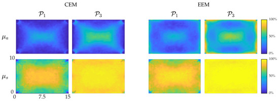 Percentages of the true values of the parameters in each node which lie inside the credibility intervals and were visualized and are shown in Figure 8. For the MAP-CEM absorption reconstructions, the credibility intervals are narrow, especially near the boundary of the domain. Near the center of the domain, the bounds are closer to the true Gaussian values of and . For the MAP-EEM absorption reconstructions, the percentages are larger, and especially near the boundaries the percentages are very close to the true Gaussian values. This indicates that using the enhanced error model increases the reliability of the credibility intervals. For the scattering, the percentages of the true values of the parameters in each node which lie inside the credibility intervals and are similar for both MAP-CEM and MAP-EEM reconstructions. However, in the MAP-EEM estimates, the values of and are closer to the Gaussian reference values.