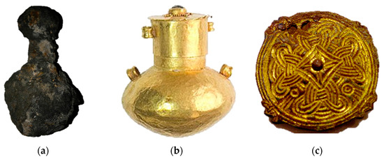 Photos of the studied cultural heritage objects: (a) the fragment of remains of ancient bireme; (b) golden vial of a Sarmatian woman; and (c) fibulae.