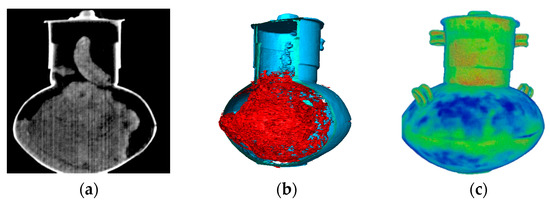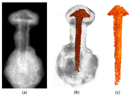 After the tomography reconstruction procedure, we obtained a large set of images corresponding to different transverse slices of the studied vial. Examples of the neutron radiographic images, as well as the tomography slices of the golden vial, are shown in Figure 5a,b. The grey regions correspond to the fossils of internal fills; the light areas are the gold walls of the vial. The virtual slice of the reconstructed 3D model of the vial is presented in Figure 5b. The fossilized remnants of the supposed incense are a formless piece with a volume of 3162 mm3. The total volume of the golden material is 615 mm3.