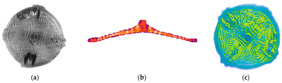A typical example of the neutron radiographic images used in the tomography reconstruction process of the fibulae is shown in Figure 6a. The fragments of fasteners and clasps of the fibulae can be clearly seen. The neutron absorption coefficients for neutrons of the gold are significantly larger in comparison to the relevant parameters for copper. Therefore, the golden ornament contrasts well with the copper body in the neutron radiography experiments (Figure 6a). The virtual cut of the 3D model of the fibulae is presented in Figure 6b. The virtual cut of the 3D model of the fibulae shows the golden thread, which is deeply pressed into the thickness of the copper body of the fibulae. This fact directly indicates the use of old Scandinavian production technology [32]. It can be assumed that the ancient burial place in Podbolotie was the burial place of a rich Viking warrior [33].