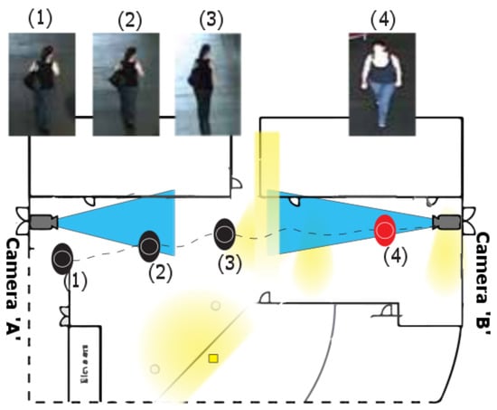 The core assumption in re-identification is that individuals do not change their clothing, so that appearances in the several views are similar; nevertheless, it still consists of a very challenging task due to the non-rigid structure of the human body, the different perspectives with which a pedestrian can be observed, and the highly variable illumination conditions. Illumination variations between non-overlapping camera views can have an immense effect on the appearance of an individual, thus increasing the difficulty of associating people in person re-identification. The variations of illumination can also be observed in the same individual at different instants, even for the same camera. A schematic illustration of the problem is given in Figure 1, where the task is to match detections of the same person acquired by the two cameras.