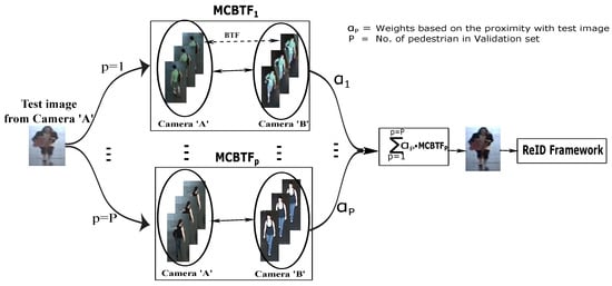 The goal of this section is to figure out a way to find the correspondence between multiple observations of a pedestrian across a camera pair  and . Like previous work [] , a limited validation set of labeled detections is used to calculate an intercamera CBTF. Subsequently, the CBTFs of each pedestrian in the validation set are weighted according to their distance with respect to the test pedestrian to form the final CWBTF.