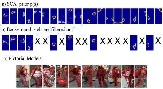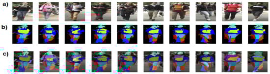 SCA has been previously considered for ReID, in particular in [,], where the authors used it to perform a background–foreground segmentation (S = 2): An example of the segmentation prior  used is shown in Figure 4a. Here, for the first time, we exploited SCA’s segmentation in multiple parts (), discarding background parts and considering the features in each part separately. An example of a learned SCA segmentation prior is shown in Figure 4a, where S = 20. After learning the stel prior, we manually filtered out the background stels, as shown in Figure 4b. It is worth noting that the model is learned only once and it is independent of the dataset. Furthermore, the background suppression is performed once and not for each individual image, because all the images have consistent segmentation.