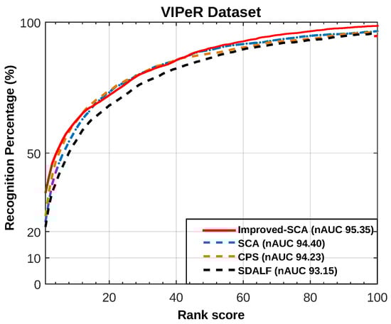 VIPeR Dataset [] contains two views of 632 pedestrians. Each pair is made up of images of the same pedestrians taken from arbitrary viewpoints under varying illumination conditions. Each image is 128 × 48 pixels and presents a centered unoccluded human figure, although cropped short at the feet in some side-views. In this dataset, we compare the performance by computing the normalized area-under-curve (nAUC) value, indicated in the figure legend. Figure 5 reports the recognition accuracy for comparing the aforementioned part-based approaches.