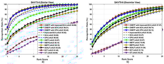 SAIVT-SoftBio [] Dataset includes annotated sequences (704 × 576 pixels, 25 frames per second) of 150 people, each of which is captured by a subset of eight different cameras placed inside an institute, providing various viewing angles and varying illumination conditions. A coarse box indicating the location of the annotated person in each frame is provided. Most of the state-of-the-art studies [,] evaluated this dataset for two camera pairs: cameras 3–8 from similar viewpoints, and Cameras 5–8 from dissimilar viewpoints with large viewing angles.