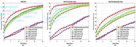 Performance Measures. We show results in terms of recognition rate as cumulative matching characteristic (CMC) curves and normalized area-under-curve (nAUC) values, as is common practice in ReID literature [,,,,,,,]. The CMC curve is a plot of recognition performance versus re-identification ranking score, and represents the expectation of finding a correct match in the top k matches. nAUC gives an overall score of how well a ReID method performs, irrespective of the dataset size. Higher curves represent better performance. The performance can also be evaluated by computing the ranked matching rates, and these results are shown in the following tables. We report all the CMC curves setting , consistently with []. We further quantified ReID performance using the graphs with P vs. nAUC. Following the literature [,,,], in all our experiments the gallery and the validation set are kept disjointed and we repeated each task 10 times by randomly picking the identities in validation and gallery. For each camera pair, we fixed the number of identities in the gallery to  for PRID 2011 and SAIVT-SoftBio,  for CAVIAR4REID and  for VIPeR.