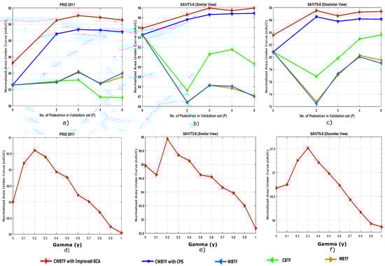Results. Figure 9 shows results for PRID 2011, and similar and dissimilar views of SAIVT-SoftBio. From these figures, the following observations can be made: (i) our approach outperforms all compared methods, which suggests that the proposed CWBTF technique works consistently well irrespective of the number of pedestrians P in the validation set; (ii) the variations of nAUC against  are consistent for all datasets as shown in Figure 9d–f; (iii) for all the datasets, the proposed approach achieves best results when  varies around  to .