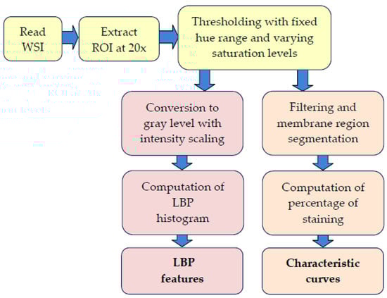 Various stages of the processing pipeline are shown in Figure 2. We used the OpenSlide application programming interface (API) [14] to read the WSIs of IHC-stained slides, and a region of interest (ROI) containing a significant portion of the imaged tissue is extracted from the middle segment of the image. Rectangular tiles of size 1800 × 1200 pixels at 20× magnification that contain at most 20% background pixels are then created and used as inputs for the method that computes LBP features and characteristic curves. At least six tiles at randomly selected locations within the ROI are generated for each WSI. The remaining part of the pipeline thresholds the input tiles and computes the LBP features and also the percentage of staining in the tissue sample to obtain the characteristic curves. These steps are detailed in the following sections.