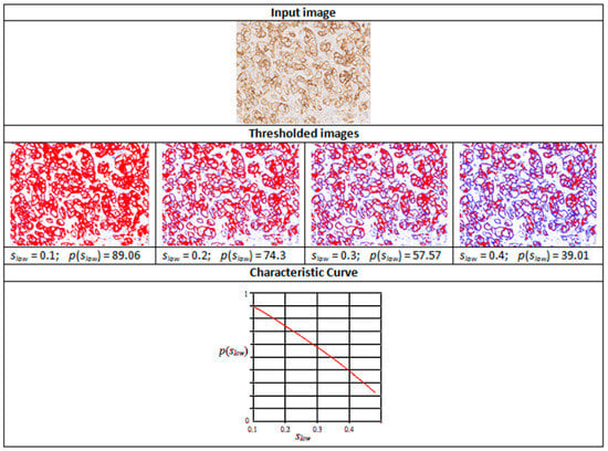 then, the variation of p(slow) plotted against slow gives the characteristic curve (or the percentage-saturation curve) of the image. In Equation (1), [h1, h2] denote fixed hue thresholds specifying allowable variations in the hue value, and similarly [v1, v2] denote value thresholds. Since we specify only the lower bound for saturation, progressively increasing slow, typically from 0.1 to 0.5, produces a non-increasing characteristic curve (Figure 3). This property of the characteristic curve is the direct result of p(slow) being proportional to the complement of a normalized cumulative histogram for saturation values.
