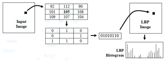 Local binary patterns (LBP) are powerful feature descriptors used for texture analysis and classification [13]. The binary pattern is derived by comparing the intensity at each pixel with its eight neighbors and encoding the information in an 8-bit integer value. This encoding can be viewed as a transformation of the input image into an LBP image as shown in Figure 5. The histogram of the LBP image is generally used for texture classification. In the area of medical image analysis, LBP methods have been successfully used in characterizing disease patterns [16,17,18] and automated diagnosis [19]. Local binary patterns have also been used for analyzing histopathological images and detecting mitotic cells [20,21]. Several variants of LBP features, such as hierarchical LPB, have also been proposed for specific applications, such as retinal vein occlusion recognition [22].