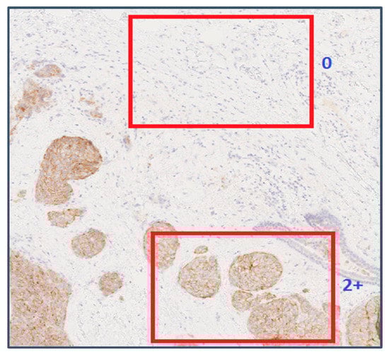Analysing the staining patterns in tiles that were wrongly classified revealed a common problem in the automatic extraction of tiles from WSIs. Some of the samples with scores 1+ and 2+ had large tissue regions without any staining. The example shown in Figure 9 contains a tissue sample at 10× magnification with an assigned score of 2+.