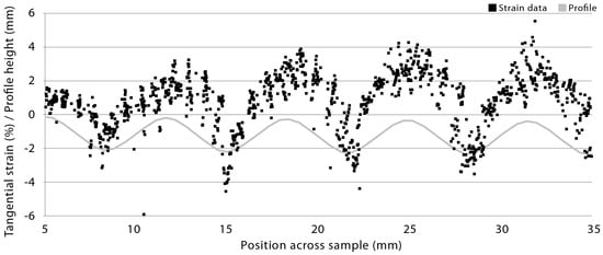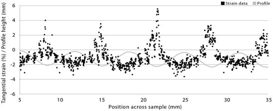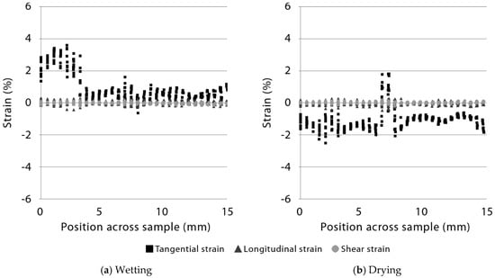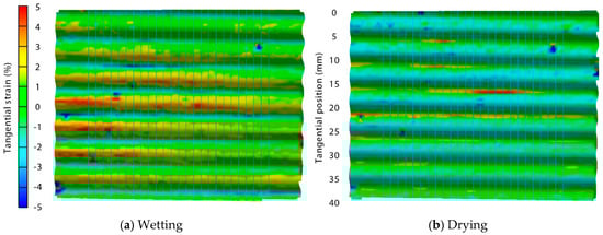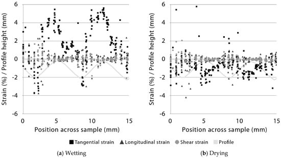 Strain data from digital image correlation of a radiata pine board with a ribble profile (sample 2, profile 1, Table 1 and Table 2) and exposed to wetting and drying is plotted in Figure 2. Tangential strain during wetting and drying is larger than longitudinal and particularly shear strains (Figure 2). The magnitude of tangential strain during wetting varies from a maximum of 5.8 to a minimum of just under −4.0 (Figure 2a). Maximum tangential strain during wetting occurs on the ridges (peaks) of the profiled board surface, and minimum strains occur in profile grooves. Such cyclical variation in tangential strains during wetting is not apparent for longitudinal or shear strains, although longitudinal strain minima occur in profile grooves (like tangential strain minima). During drying, strain data is shifted towards more negative values indicating shrinkage at the surface of profiled boards, as expected (Figure 2b), but positive strains are observed, indicating swelling. In particular, high positive tangential strains are observed in profile grooves, which is the opposite pattern to that observed during wetting. The same reversal of tangential strains during wetting and drying was observed in boards with a more wavy ‘ripple’ profile (Figure 3 and Figure 4, sample 2, profile 2, Table 1 and Table 2).