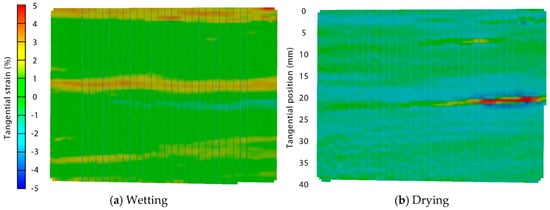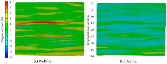 Figure 6 plots the tangential, longitudinal and shear strains in the flat radiata pine deck board (sample 2, Table 1), that is the sister to the ribble and ripple boards whose strains are shown in Figure 2, Figure 3, Figure 4 and Figure 5. Tangential strains during wetting are positive, indicating swelling, and are larger than longitudinal or shear strains. Shear strains are close to zero and longitudinal strains are slightly negative. An area with high tangential strain can be observed on the left-hand side of Figure 6, indicating pronounced surface swelling in this region of the deck board sample.