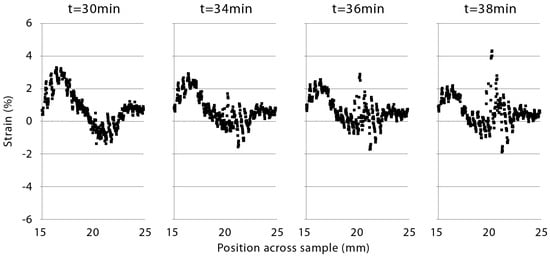 The development of the area of high positive strain in a flat board (sample 2, Table 1) that was associated with the formation of a check (Figure 8) is also shown in Figure 9. The first graph in this figure shows the local strain at the end of the wetting cycle in the area where the check developed (t = 30 min). There is an area of negative strain between two areas of positive strain, creating a sinusoidal strain pattern. After four min of drying (t = 34 min), strains decrease in magnitude, but high positive strains begin to develop in the area that had negative strain during the wetting cycle. These strains continue to increase in magnitude over the next 4 min, resulting in the development of a check (t = 36 min and 38 min). Sinusoidal strain patterns were present in all the flat decking samples that were tested. The boards did not always check, but when they did, checks invariably formed in these areas.
