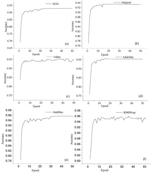 In this figure, we draw the recognition accuracy obtained with NA-6 network architecture at different optimizers (a) SGD; (b) Adagrad; (c) Adam; (d) AdaDelta; (e) AdaMax; (f) RMSProp; on the ISIDCHAR database at each epoch.