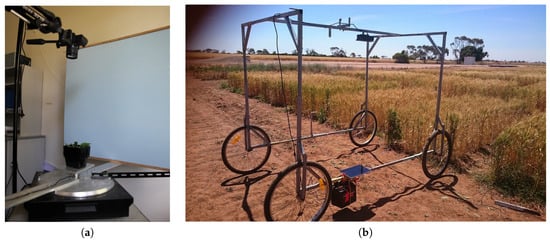 This figure shows the two imaging platforms we have build in house for imaging plants. (a) is the platform for imaging plants indoor and (b) is the platform for imaging outdoor plants growing in field conditions.