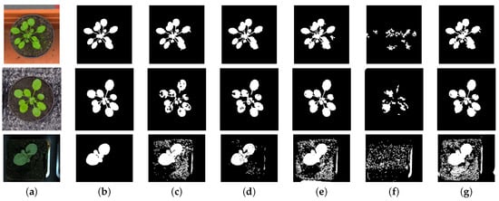 This figure shows the results of segmentation using the method of mean-shift clustering, used in the paper, for different colour spaces. Image in column (a) are the original images of Arabidopsis and Tobacco plants. One set of Arabidopsis plant has a contrasting red background and the other has black background. The images in column (b) are the ground truth segmentation results. The ground truth segmentation were generated by manual labelling of the image data. In columns (c–g) are the segmentation in different colour spaces , , -, normalized , and , respectively.