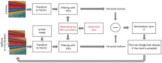 - Kacker, D.; Allebach, J.P. Joint halftoning and watermarking. IEEE Trans. Signal Process. 2003, 51, 1054–1068. [Google Scholar] [CrossRef]