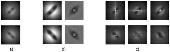 In the case of our dispersed-dot halftones, it makes sense to use image moments as orientation descriptors if they are calculated in frequency domain. An example of DFT representation of the embedded features is shown on Figure 2b,c. However, due to moment’s sensitivity to noise and poorer orientation discrimination ability in cases of more-than-two embeddable orientations [10,16], they are not suitable for orientation detection of CDBS-OM embedded data.