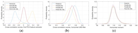 (a) Probability densities for the extracted feature using the first PCA extractor (second PCA component in Figure 4c), calculated on training data in Cx channel with four different orientations; (b) Probability densities for extracted feature using horizontal LMS-filter; (c) Probability densities for horizontal moment.