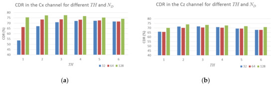 CDR for all images and capture devices using dictionary-based detector, in the Cx (a) and Cz channel (b), depending on the dictionary size (color-coded) and the number of atoms used in the detection .