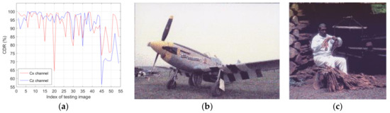 The 54 testing images include a wide variety of content. Some of them have areas with extreme dark or light levels, or heavily saturated areas that include a dominant single colorant or dominant halftone pixel value. In those types of image areas, oriented features may not be embedded at all, or have very poor strength. That means that the highest CDR of 100% may not be possible regardless of the detector used, simply because some of the oriented features were not (or were poorly) embedded with the CDBS-OM method and therefore are not present in the printed images. To demonstrate this, we show an example in Figure 7. The CDR from the 600 dpi scans using the proposed detector is shown in Figure 7a. It can be seen that for some of the testing images, a CDR of 100% was achieved in the Cx or the Cz channel. Figure 7b shows the scanned 20th testing image. The large sky area is very bright, and the OM data embedding resulted in covering the sky area with only yellow colorant dots. The data can be relatively correctly extracted from the blue-yellow Cz channel—the CDR is around 94%. However, the absence of magenta or cyan dots in the sky area (used for rendering red or green tones) means that the data were not actually embedded in the red-green channel of that sky area, resulting in low CDR of around 65%. Figure 7c shows the scanned 45th testing image. There are large very dark areas where the OM embedded data cannot be extracted due to absence of oriented red-green or blue-yellow variations. That results in low CDR for both channels. However, the CDR in the Cx channel of the 45th image is significantly higher than the CDR in the Cz channel. That is mainly due to the darker tones present in the image, which are rendered using mostly darker (including red and green) colorant dots.