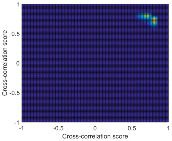 Another discussion point is the comparison between detection using LMS-filters as feature extractors, and the proposed PCA learned feature extractor. The LMS-filters as feature extractors for detection have been used in other similar halftoning-and-watermarking methods [5,26]. However, in this work we show that they are inferior to the proposed feature extractors, which can be mainly attributed to the fact that they are responsive to not just the embedded data but to the visual content as well. That degrades their ability for discriminating orientations despite the ML detection criterion, and may render them impractical in scenarios where the detection is performed on images captured using unknown devices. Another way to illustrate the difference in orientation-discrimination ability between the LMS-filters and the proposed PCA-based feature extractors is by looking at the joint probability densities of the extracted features using the LMS-filters—we consider a two-orientations case (horizontal and vertical orientation) so that the joint probability densities are 2D and suitable for visualization. The joint probability densities of extracted features for those two orientations using LMS-filters, and , are shown in Figure 10. They span smaller space and are very close to each other—making them more sensitive to variation/shifts in the cross-correlation scores due to changes in the print-and-scan channel. While Figure 5a shows the relevant two probability densities of extracted features using the proposed PCA template, shown with blue line and shown with yellow line. They are 1D as only one PCA feature can discriminate the two orientations, the two curves are barely overlapping and are distant from each other, span larger range of the cross-correlation axis, and hence are more robust to variations in the feature distributions for different scan/capture devices.
