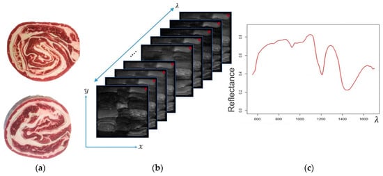 Recently, hyperspectral imaging (HSI) systems have gained attention in a plethora of research areas such as medical applications, remote sensing imagery [1,2,3], food and meat processing [4,5,6,7,8,9], etc. The key advantage of HSI systems is that they provide a combination of spectroscopy technologies [10] (i.e., availability of spectral information) and conventional imaging systems (i.e., availability of spatial information). Thus, this combination covers information about the objects shown in an image across the electromagnetic spectrum; this means it provides a unique signature for each visualized material. Figure 1c shows examples of the spectral signatures of four types of materials: lamb, beef, pork, and fat.
