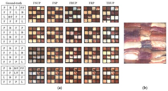 (a) The calibration samples in frames: Ground-truth and false-color images for frames 1–4 (top to bottom), where FSUP is short for fresh red-meat unpacked, FSP for fresh packed, FRUP for frozen unpacked, FRP for frozen packed, and THUP for frozen-thawed unpacked. In the cells of ground truth, F is for fat, L for lamb, B for beef, and P for pork; (b) Evaluation-sample frame in case of FSUP.