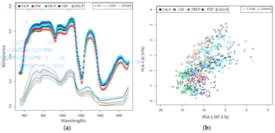 In this work, the dataset that is described in Section 3.2 was used for estimating a PCA model. The calibration set of images was manually segmented (according to the ground truth) into small regions (like 100 pixels); then, the mean spectrum of each segment was extracted. A PCA model was fitted for these spectra. In fact, we used the estimated PCA model for the following purposes: (1) for visualizing the patterns between the pre-defined classes (LAMB and OTHER); and (2) as a preprocessing step for extracting the spatial features. Figure 4a shows the mean spectrum of the extracted spectra for each class; it clearly shows that there are significant differences in the mean spectrum for each class. Figure 4b visualizes the class separation in the PCA space; the class distribution shows that the classes are separated into regions with minor over-lapping regions (this overlapping is due to the frozen status of the meat).