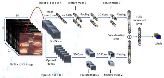 An illustration of the proposed CNN model. Input 1 represents the mean spectrum as the vector. Input 2 shows the spatial window at the selected optimal bands as a 3D cube. The labels represent the predefined classes (i.e., Lamb, Other, Fat).