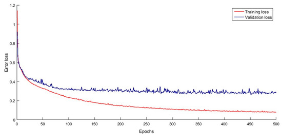 For training the model, we used mini-batch SGD with the backpropagation algorithm for minimizing the loss function in Equation (6) and updating the weights of each layer. The learning rate of SGD is set as 0.003. As we used a small learning rate and the training processes are repeated for 500 iterations (i.e., 500 epochs), we decided to add a momentum term into the weights updating criteria for accelerating the training processes, where the momentum value was set to 0.90. Figure 7 shows the loss of training and validation samples during the training iterations. The learning curve shows that the validation error converged after 300 iterations, while the training is still decreased, which means that the model learns generalized features and no overfitting accrues. Both of the losses are converged after 450 iterations; thus, the means of these final weights (i.e., the weights of last 50 iterations) were used as the final.