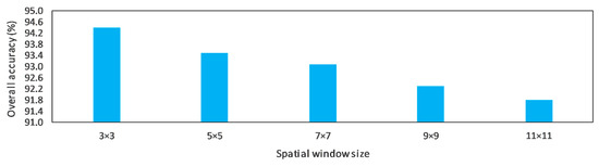 The proposed CNN model extracts a set of features crossing the spectral and spatial domains. In our experiments, we investigated the influence of the spatial window size (i.e., input 2 in our architecture in Table 3). We completed many experiments to optimize the best spatial size. The results show that the best spatial size is 3 × 3 in applying the model to our application (meat processing). Figure 8 shows the influence of the spatial size on the overall accuracy.