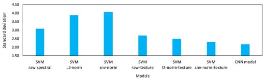 Selecting the best of the proposed model depends on the robustness of the model to be invariant related to the meat status, the ability to detect the undesired meat (i.e., the adulteration situation), and the simplicity of the model. The results show that the proposed CNN model satisfies these conditions where it performed better in the average overall accuracy. In addition, we analyzed the variation in the accuracies over all statuses; Figure 9 shows the standard deviation of the accuracies for all meat states. The CNN model had the lowest standard deviation compared with the other models; for example, SVM with SNV-texture has 2.31 standard deviation. This result means that the performance of the CNN model is more stable compared with the others.