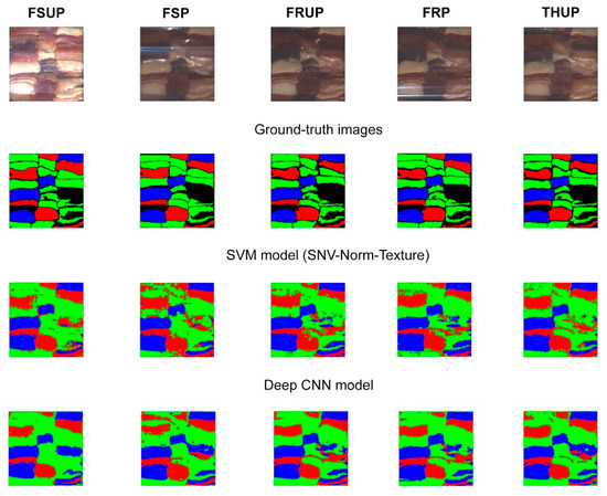 The visual results in Figure 10 show the robustness of the proposed CNN model. In Figure 10, we see that the detection of the undesired muscles is significantly improved; the visual comparison between SVM and CNN shows that the detection of OTHER class is more accurate and the edges between the meats types are well maintained.