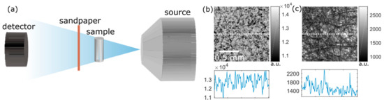 (a) Illustration of the experimental alignment. X-ray image of (b) sandpaper and (c) steel wool, and profiles from the dashed lines.