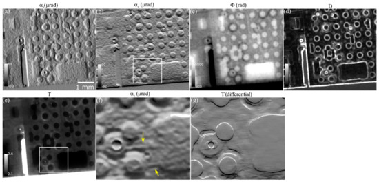 The first result presented here is the multi-contrast radiography of an IC chip. The image was acquired with an exposure time of 5 min. The imaging processing uses a cross-correlation window width of 27 pixels with hamming weighting. The choice of the subset window size is a tradeoff between the spatial resolution and the noise level [25,27]. It is flexible, with a thumb of rule of being larger than the speckle size. Figure 2 shows the results of the multi-contrast images with the refraction angle in horizontal and vertical directions shown in Figure 2a,b, respectively; the phase shift in Figure 2c, the dark-field image in Figure 2d and the transmission image in Figure 2e. Figure 2f,g are the marked areas from the refraction angle Figure 2b and the vertical differential of the transmission image Figure 2e, respectively. The differentiation is taken to have a more visually straightforward comparison with the differential of the phase signal, as the derivative of a signal has the potential of higher sensitivity to small structures. From Figure 2f, we can distinguish structures beneath the resistor, such as the example indicated by the arrows in the figure, but in Figure 2e,g, there is not enough attenuation-contrast for the structures. For a non-destructive examination of strong absorbing products, like in this example, the speckle-based technique can realize multi-contrast imaging from a single data set and provide complimentary information. Structures that cannot be identified from the conventional attenuation signal can hence be examined from signals based on other modalities. The flexible experimental arrangement and low-cost wavefront modulator can allow this technique to be easily implemented for online quality control or production monitoring in laboratories or industry.