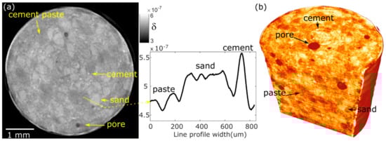 The second example is a tomography scan of a mortar specimen. Cement mortar is one of the most commonly used construction materials. To understand the materials’ physical properties, such as strength, permeability, etc., extensive knowledge of their microstructure and composition is essential. Various imaging techniques have been applied to study the microstructure, such as light microscopy, electron microscopy, etc. [28,29]. Being non-destructive, X-ray tomography has the advantage of conserving the original state of the sample and removes the need for sophisticated sample preparation [30,31]. Attenuation contrast works well between pores and groundmass, but faces challenges distinguishing other components. XPCI has been applied on porous samples using the grating-based technique at synchrotron facility and with a conventional X-ray tube [32,33]. High resolution phase-contrast tomography has been achieved using methods such as the Zernike phase-contrast method and ptychography, at synchrotron sources [34,35]. A complex refractive index was retrieved from the phase and absorption signal. With similarities in imaging technique to the grating-based method, the speckle-based method has the potential for a similar achievement, with a more cost-efficient and more flexible manner that, offers complimentary information for laboratory non-invasive examinations.