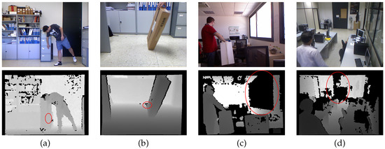 In the last three cases, where depth cannot be measured at a given pixel, the sensor returns a special non-value code to indicate its inability to measure depth [32], resulting in an invalid depth value (shown as black pixels in the depth images reported in Figure 1). These invalid values must be suitably handled to exploit depth for background subtraction.