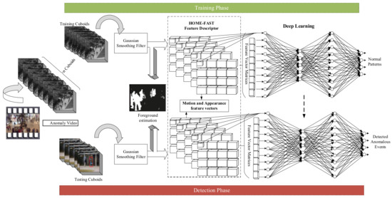 First, the input video is separated into a set of training and testing cuboids as non-overlapping n × m × t blocks, as shown in Figure 1. The proposed architecture is partitioned into the preparing and testing stage. In both phases, first, the frames are admitted to Gaussian filtering. After performing Gaussian smoothing, the foreground parts are extracted from a video. Then, the proposed HOME-FAST feature extractor extracts the motion and appearance features to identify the anomaly. This feature descriptor extracts the high-level features and uses them as input to the DNN along with the low-level information (input frames) to classify normal and abnormal events in the video. In the training phase, the feature descriptor at the spatial location is kept as a normal pattern at a particular spatial region. In the testing phase, the deep learning approach searches for a similar pattern from a training pattern. The events are considered as abnormal if none of the similar patterns are present.