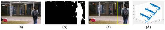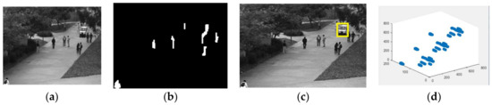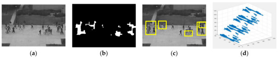 Illustration outlines for the Peds1 datasets. Inconsistent occasions are featured by boxes. (a) Original image; (b) background subtraction frame; (c) abnormal event detected frame; and (d) three-dimensional (3D) plot representation.
